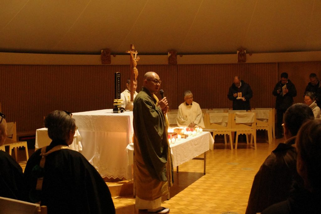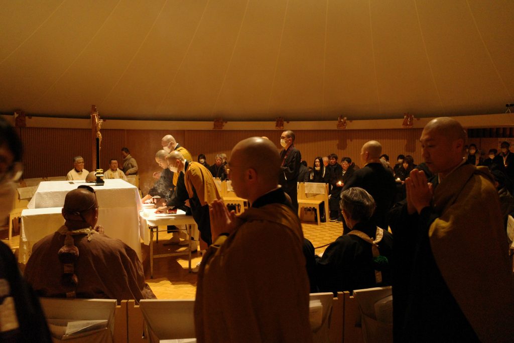 たかとり教会での法要の結びには、全日本仏教青年会理事長の来馬司龍師が挨拶を述べられました。発災から30年を迎えた昨年、そして三十三回忌にあたる来年という「節目」の重みに触れつつ、それにとらわれることなく、毎年変わらぬ慰霊の思いを持ち続けることの大切さを語られました。